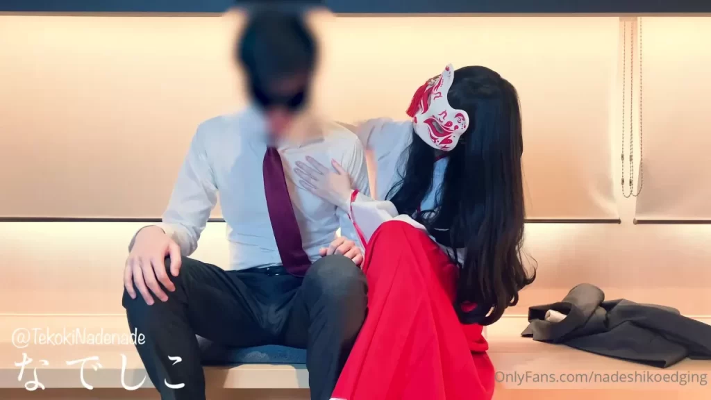A masked Asian girl in a red dress sits on a guy’s lap in what looks like an office or waiting area. He’s in a suit and tie, keeping it formal while she leans in for intimacy. The natural lighting gives it a soft feel, but the vibe is pure heat. She’s slim with long black hair, and he’s got that sharp, clean-cut look. They start slow, teasing each other, but it’s clear they’re building toward something more intense. The camera stays tight, focusing on their connection and the tension between them.