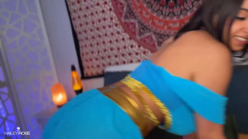Hailey Rose plays a curvy Princess Jasmine with dark brown hair, gold bangles, and visible tattoos. She starts off dancing alone in a dimly lit room with tapestries and candles, wearing a blue top that she eventually pulls down to expose her big natural tits. The mood shifts fast when she drops to her knees outside on a blanket in broad daylight, sucking Max’s cock with close-ups showing her lips stretched around his shaft. He takes her from behind doggy style, then flips her onto her back for creampie — you see the creampie load drip out after he pulls out. The whole thing switches between raw outdoor sex and stylized indoor fantasy vibes, with clear focus on her body and the cumshot.