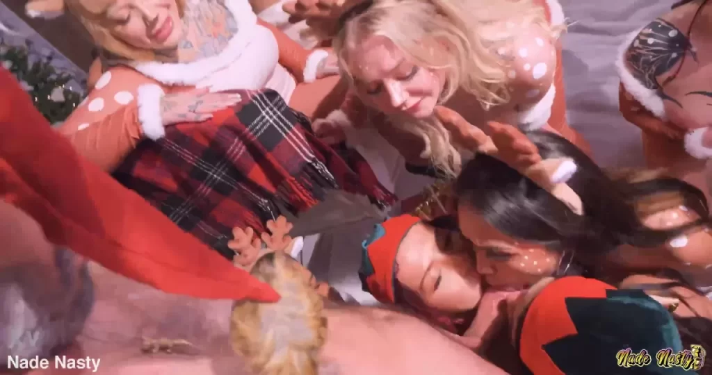 Big-titted brunette in reindeer antlers is the first to ride Nade Nasty, who’s dressed as Santa with a full beard and inked arms. She grinds hard, bouncing up and down while he stays seated on a couch in front of a lit Christmas tree. Next, a black girl with long braids deepthroats him in doggy, then switches to missionary with creampie follow-through. The whole video’s a chaotic orgy — multiple women in slutty holiday outfits swapping positions, sucking dick, getting fingered, and fucking each other while Nade stays in the middle taking turns. Camera stays wide for most of it, so you see all five women moving around the room, stripping, grinding, and waiting their turn. One freckled redhead gives a nasty blowjob with eye contact, then gets flipped into doggy with her ass slapped hard before coming.