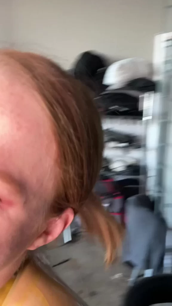 A brunette girl, slim and petite, walks around a studio loft with exercise equipment and natural light flooding in. She has her brown hair tied back and stretches her arms out at one point, seeming relaxed but focused. Later, she switches to a blonde wig and straps on a harness, standing confidently in front of the camera. The scene is all about her prep and the gear, with a mix of medium and close-up shots to highlight her movements.